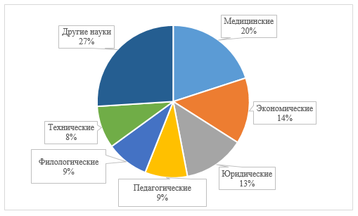 В 2019 году выпущено более 450 аспирантов. Наибольшая их доля пришлась на медицинские (20 процентов), экономические (14 процентов) и юридические (13 процентов) отрасли науки.