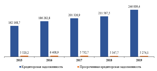 Кредиторская задолженность на конец 2019 года определилась в размере 246 009,4 млн. сомов, увеличившись на 16,3 процента по сравнению с 2018 годом.