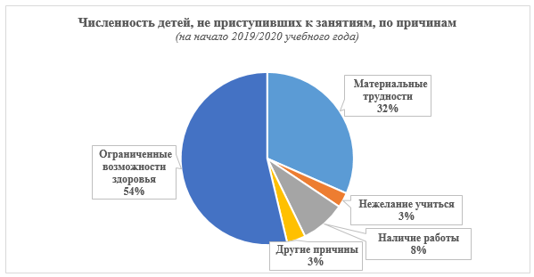 Из общего числа не приступивших к занятиям на начало 2019/2020 учебного года, более половины, или 1,5 тысячи приходилось на детей с ограниченными возможностями здоровья, среди них около 69 процентов дети с недостатками умственного развития и 25 процентов - с недостатками физического развития. Большинство из них (более 70 процентов) проживают в сельской местности. Одной из основных причин непосещения ими школ является их недоступность, так как большинство специализированных школ для детей с ограниченными возможностями расположены в г. Бишкек и Чуйской области.