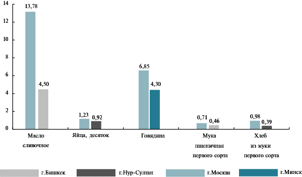 В декабре 2019 года уровень средних розничных цен на молоко пастеризованное по городу Бишкек сложился выше цен, наблюдаемых в городе Нур-Султан - на 4,1 процента и городе Минск - на 8,1 процента, говядину в городе Нур-Султан - на 1,2 процента, в городе Минск - на 15,9 процента, а на хлеб из муки первого сорта в городе Нур-Султан - на 38,1 процента, в городе Минск – на 3,2 процента. Вместе с тем, в декабре 2019 года средние цены на яйца по городу Бишкек превысили их уровень по городу Нур-Султан - на 13,2 процента.