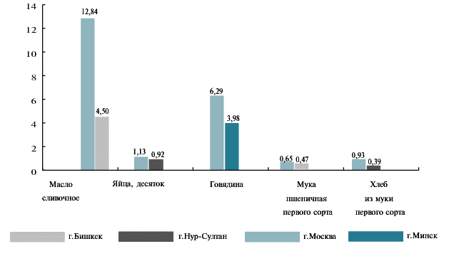 В феврале 2020 года уровень средних розничных цен на молоко пастеризованное по городу Бишкек сложился выше цен, наблюдаемых в городе Нур-Султан - на 3,9 процента и городе Минск - на 10,5 процента, говядину в городе Минск - на 22,0 процента, а на хлеб из муки первого сорта в городе Нур-Султан - на 38,1 процента, в городе Минск – на 7,9 процента. Вместе с тем, в феврале 2020 года средние цены на яйца по городу Бишкек превысили их уровень по городу Нур-Султан - на 14,8 процента.