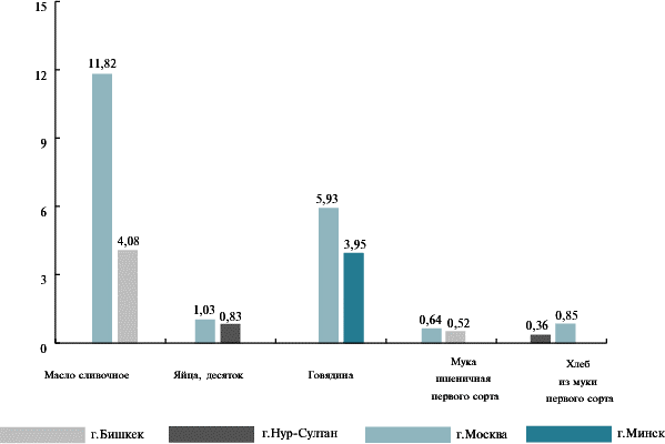 Сравнительный анализ покупательной способности среднемесячной заработной платы2 по столицам отдельных государств-членов ЕАЭС свидетельствует о том, что в июле 2020 года она по продуктам первой необходимости в городе Бишкек отставала от их уровней в других столицах ЕАЭС, что обусловлено низким размером средней заработной платы по городу Бишкек. Например, в Бишкеке на среднюю заработную плату можно купить 855 килограмма картофеля, тогда как в Москве – в 2,7 раза больше (2 318 килограмма). В городе Нур-Султан на одну заработную плату можно приобрести 1,1 тонны муки первого сорта, а в городе Бишкек - в 1,8 раза меньше (622 килограмма).