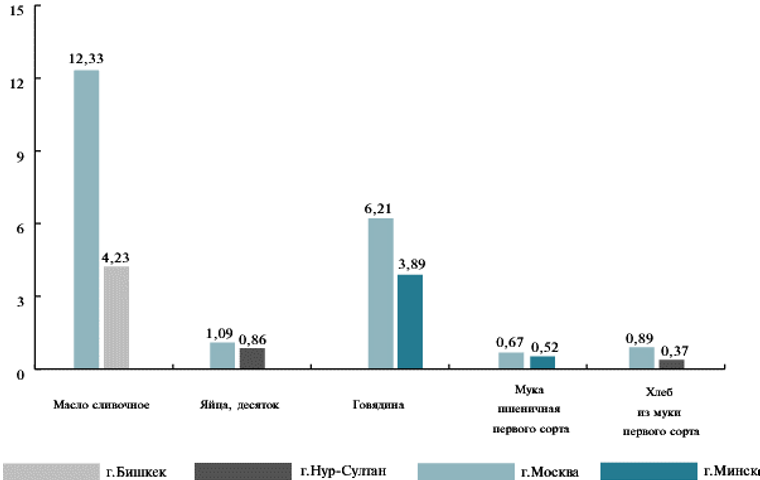 В июне 2020 года максимальная средняя потребительская цена на картофель (0,78 долларов за 1 килограмм) была отмечена в городе Минск, а минимальная розничная цена (0,51 долларов США за 1 килограмм) - в городе Нур-Султан. Наиболее низкие цены на говядину (3,89 долларов США за 1 килограмм), молоко пастеризованное (0,64 долларов США за 1 литр), муку первого сорта (0,52 долларов США за 1 кг) за этот же период наблюдались в городе Минск. Минимальные цены на баранину зафиксированы в городе Бишкек (4,63 долларов США за 1 килограмм).