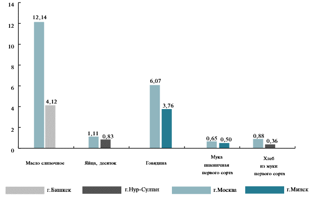 Сравнительный анализ покупательной способности среднемесячной заработной платы2 по столицам отдельных стран ЕАЭС свидетельствует о том, что в мае 2020 года она по продуктам первой необходимости в городе Бишкек отставала от их уровней в других столицах ЕАЭС, что обусловлено низким размером средней заработной платы по городу Бишкек. Например, в Бишкеке на среднюю заработную плату можно купить около 700 кг картофеля или около 561 килограммов муки первого сорта, тогда как в Москве – в 4,8 раза больше (3 320,9 килограммов картофеля) или 4,1 раза больше (2 282,4 килограммов муки). В городе Минске на одну заработную плату можно приобрести около 1,5 тонны муки первого сорта, а в городе Бишкек – в 2,5 раза меньше (561 килограмма).