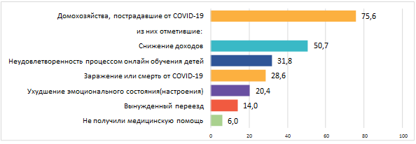 В целом от Covid-19 пострадали около 76% домохозяйств, столкнувшись как минимум с одной из трудностей, произошедших из-за вспышки инфекции: в домохозяйстве снизились доходы, и/или родители/опекуны детей не удовлетворены процессом онлайн обучения, и/или хотя бы один член домохозяйства заразился или умер от коронавируса, и/или кто-либо из взрослых членов домохозяйства ощущал себя «очень и чрезвычайно» подавленным, удрученным или чувствовал безнадежность из-за новостей, угроз и ограничений, связанных с коронавирусом, и/или хотя бы один член домохозяйства вынужден был переехать жить в другое место и/или нуждался в медицинской помощи по любой причине, но не смог ее получить.