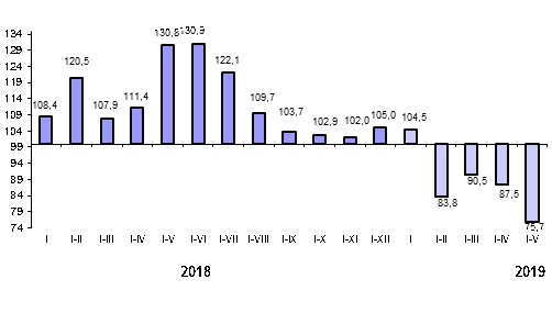 Внешнеторговый оборот Кыргызской Республики, по предварительным данным, в январе-мае 2019 года составил 2,7 млрд. долларов США и по сравнению с январем-маем 2018 года снизился на 2,6 процента, при этом экспортные поставки увеличились на 3,7 процента, а импортные поступления сократились на 4,7 процента.