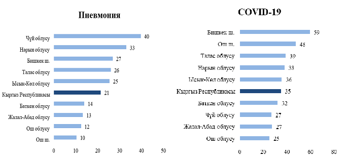 Наибольшее превышение среднереспубликанского показателя смертности от пневмонии отмечалось в Чуйской и Нарынской областях, а также в г.Бишкек, тогда как смертности от коронавирусной инфекции (COVID-19) – в городах Бишкек и Ош, а также Таласской области.