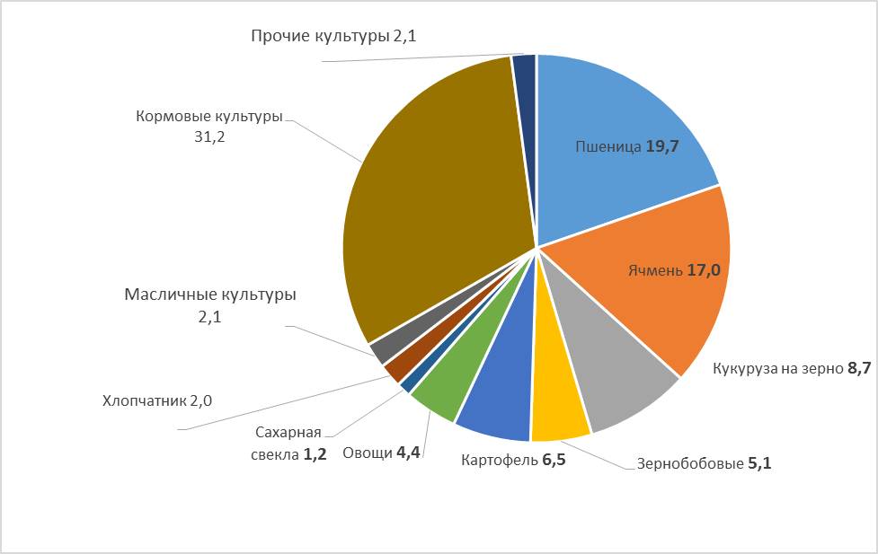 В структуре посевных площадей сельскохозяйственных культур под урожай 2019г. доля пшеницы составила 19,7 процента, ячменя - 17,0 процента, кукурузы на зерно - 8,7 процента, картофеля - 6,5 процента, овощей - 4,4 процента, сахарной свеклы - 1,2 процента, хлопчатника - 2,0 процента, масличных культур - 2,1 процента, кормовых культур - 31,2 процента.