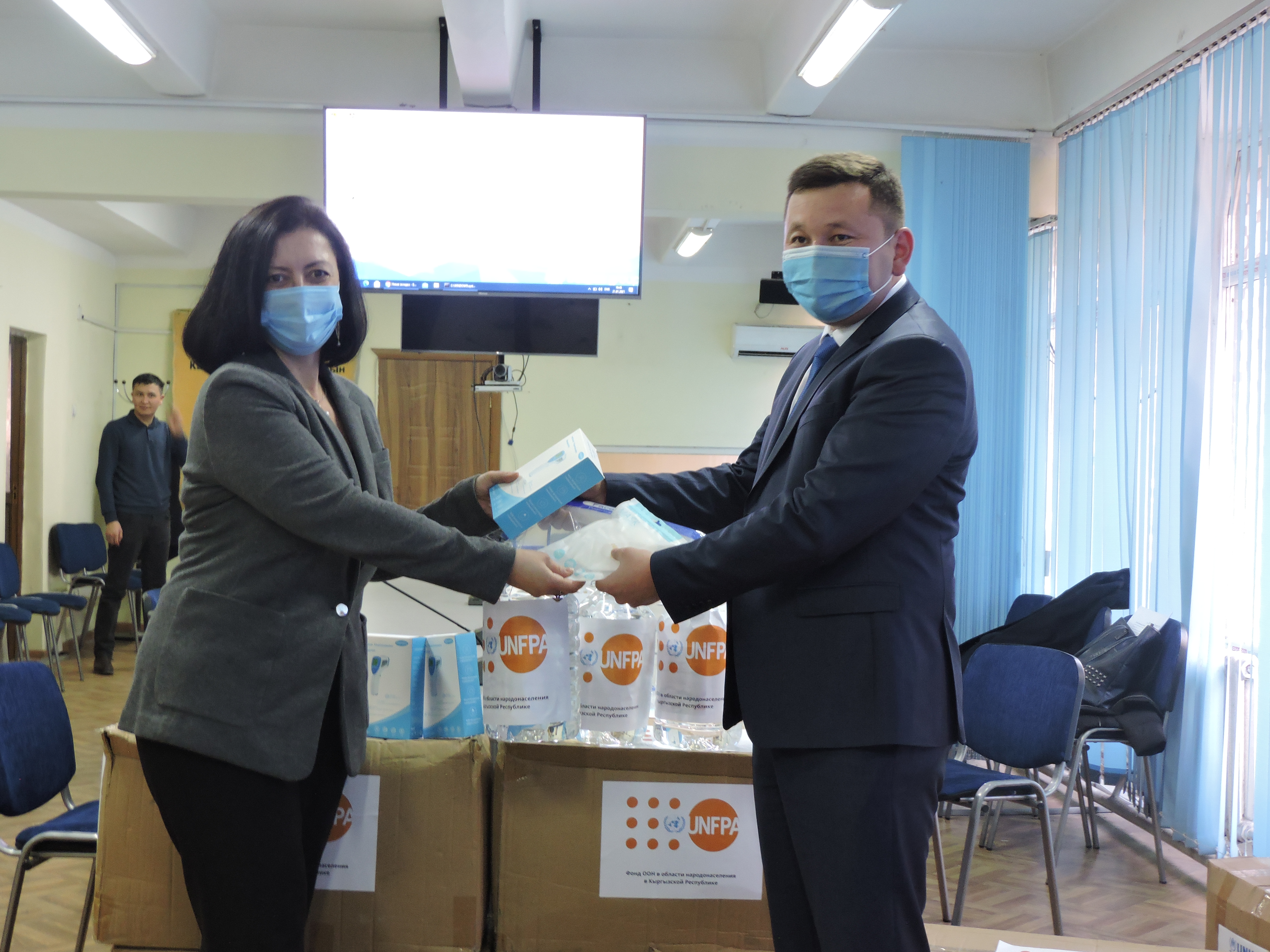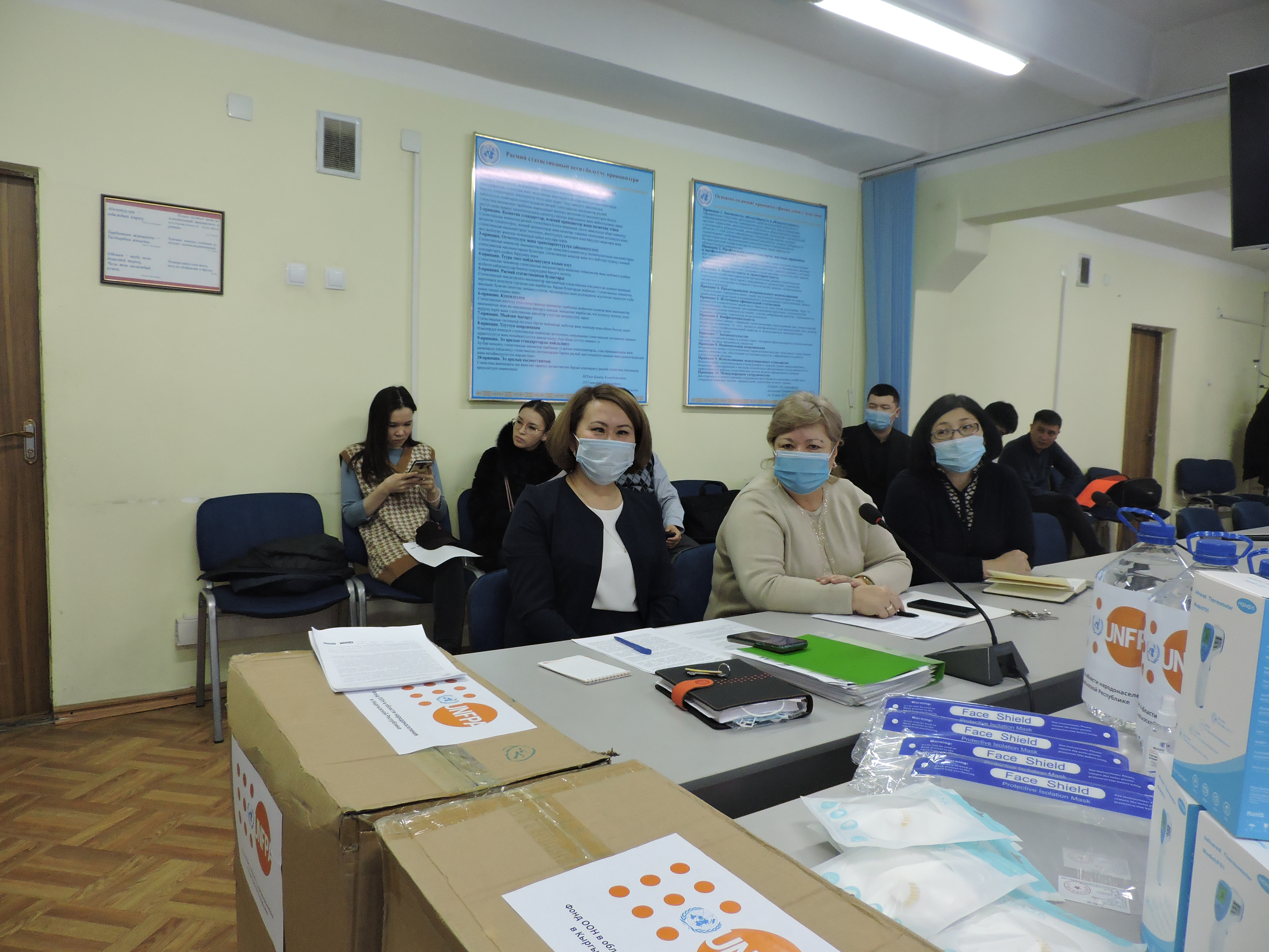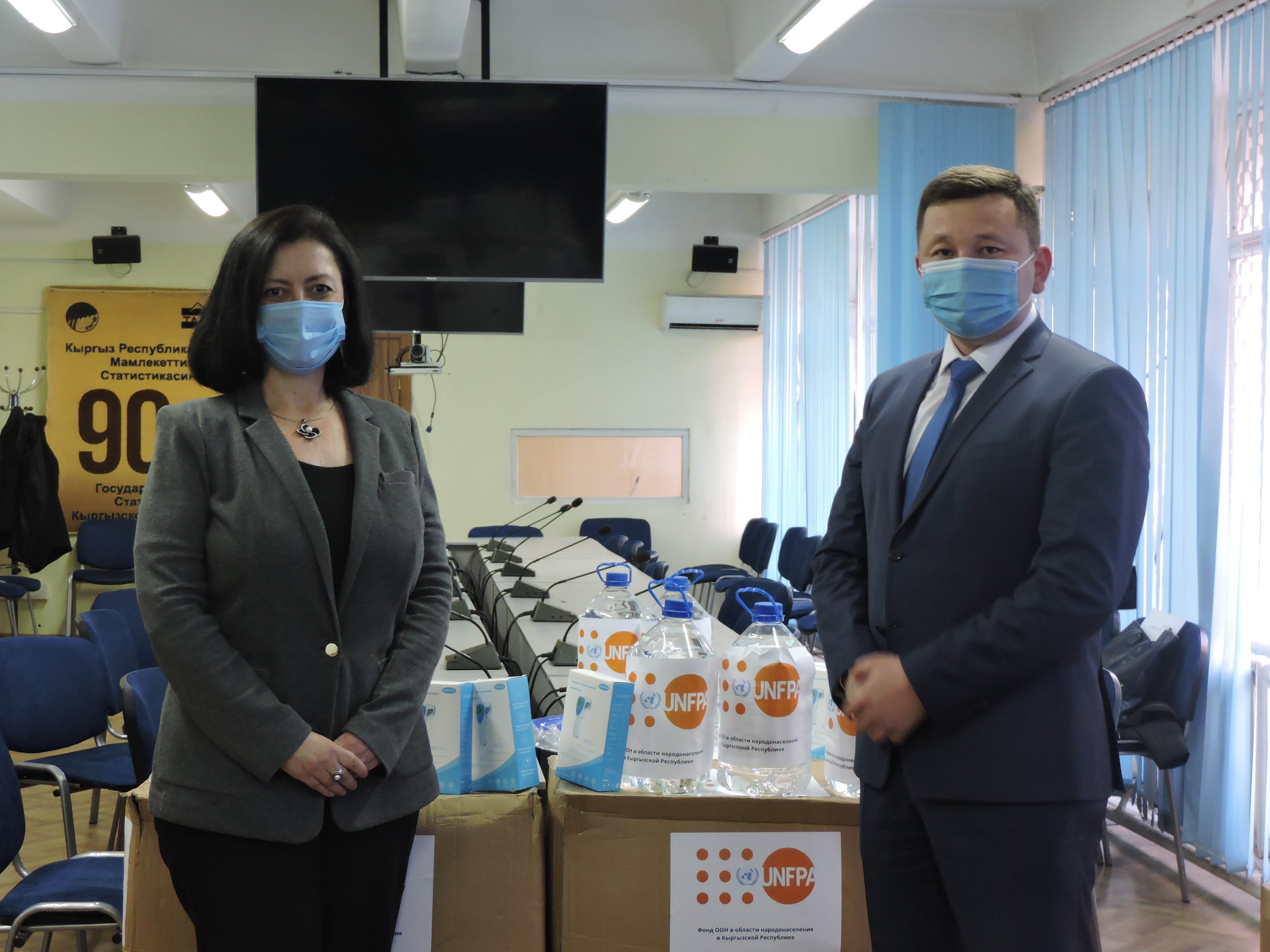 В результате переговоров Фонд ООН в области народонаселения (ЮНФПА), при финансовой поддержке Правительства Германии закупил средства индивидуальной защиты (пятислойные респираторы KN95, карманные антисептики, бесконтактные термометры, щитки) для временного переписного персонала в соответствии с правилами, предусмотренными алгоритмом действий в ходе проведения предстоящей переписи населения и жилищного фонда Кыргызской Республики в условиях коронавирусной инфекции.