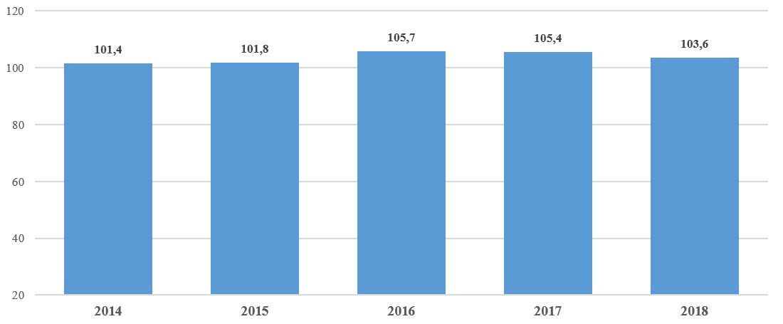 Наибольший рост производительности труда в 2018 году по сравнению с 2014 годом отмечался в строительной деятельности (на 82 процентных пункта), сфере водоснабжения, очистки, обработки отходов и получения вторичного сырья (на 49 процентных пунктов) и добыче полезных ископаемых (на 16 процентных пунктов).