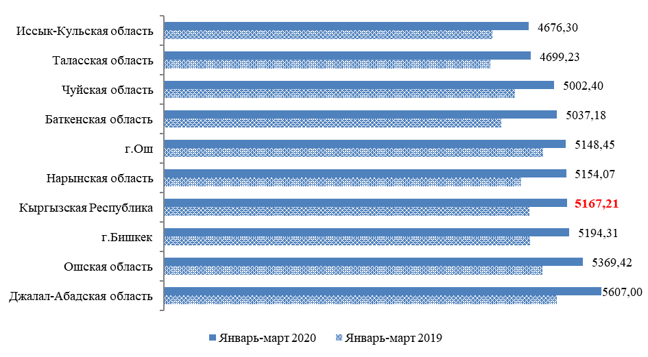 Величина прожиточного минимума в I квартале 2020 года в среднем на душу населения составила 5167,21 сома и по сравнению с соответствующим периодом прошлого года выросла на 10,4 процента. Рост величины прожиточного минимума в январе-марте отмечен во всех регионах Кыргызской Республики.