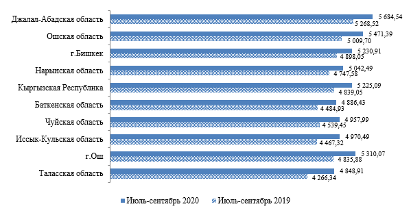 Величина прожиточного минимума в III квартале 2020 года составила 5 225,09 сома и по сравнению с соответствующим периодом прошлого года возросла на 8 процентов. Рост величины прожиточного минимума в июле-сентябре отмечен во всех регионах республики.
