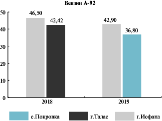 При этом, отмечалась дифференциация розничных цен на ГСМ на рынках того или иного региона. В июле 2019 года максимальные средние потребительские цены на бензин А-92 зафиксированы в городе Исфана (42,90 сома за литр), городе Баткен (42,21 сома за литр) и городе Кара-Суу (41,55 сома за литр). В то же время, минимальные розничные цены наблюдались в селе Покровка (36,77 сома за литр), городе Талас (37,96 сома за литр) и городе Токмок (37,94 сома за литр).