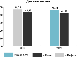 Что касается дизельного топлива, то максимальные средние потребительские цены зафиксированы в городе Кара-Суу (46,30 сома за литр), городе Баткен (46,30 сома за литр) и городе Ош (46,20 сома за литр). Наряду с этим, минимальные цены на дизтопливо отмечены в селе Покровка (42,70 сома за литр), городе Талас (42,06 сома за литр) и городе Токмок (42,09 сома за литр).