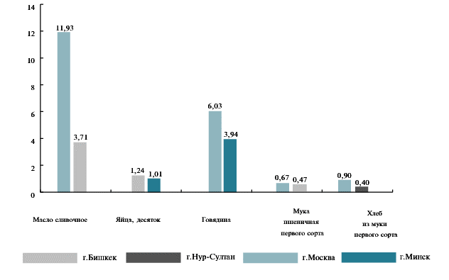 В феврале 2021 года уровень средних розничных цен на молоко пастеризованное по городу Бишкек сложился выше цен, наблюдаемых в городе Минск - на 3,0 процента, говядину в городе Минск - на 26,4 процента, а на хлеб из муки первого сорта в городе Нур-Султан - на 27,3 процента и городе Минск - на 7,3 процента. Вместе с тем, в феврале 2021 года средние цены на яйца в городе Бишкек превысили их уровень по городам Минск - на 18,5 процентов, Нур-Султан и Москва - на 9,7 процента.