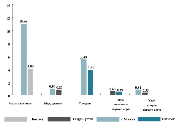 Сравнительный анализ покупательной способности среднемесячной заработной платы2 по столицам отдельных государств-членов ЕАЭС свидетельствует о том, что в сентябре 2020 года она по продуктам первой необходимости в городе Бишкек отставала от их уровней в других столицах ЕАЭС, что обусловлено низким размером средней заработной платы в городе Бишкек. Например, в Бишкеке на среднюю заработную плату можно купить 59 килограммов говядины, тогда как в Москве - в 3,8 раза больше (226 килограммов). В городе Нур-Султан на одну заработную плату можно приобрести более тысячи килограммов муки первого сорта, в то время как в городе Бишкек - 545 килограммов.