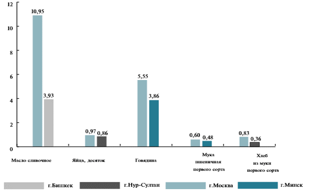 Сравнительный анализ покупательной способности среднемесячной заработной платы2 по столицам отдельных государств-членов ЕАЭС свидетельствует о том, что в октябре 2020 года она по продуктам первой необходимости в городе Бишкек отставала от их уровней в других столицах ЕАЭС, что обусловлено низким размером средней заработной платы по городу Бишкек. Например, в Бишкеке на среднюю заработную плату можно купить 56 килограммов говядины, тогда как в Москве - в 3,7 раза больше (205 килограммов). В городе Нур-Султан на одну заработную плату можно приобрести более тысячи килограммов муки первого сорта, а в городе Бишкек - 550 килограммов.