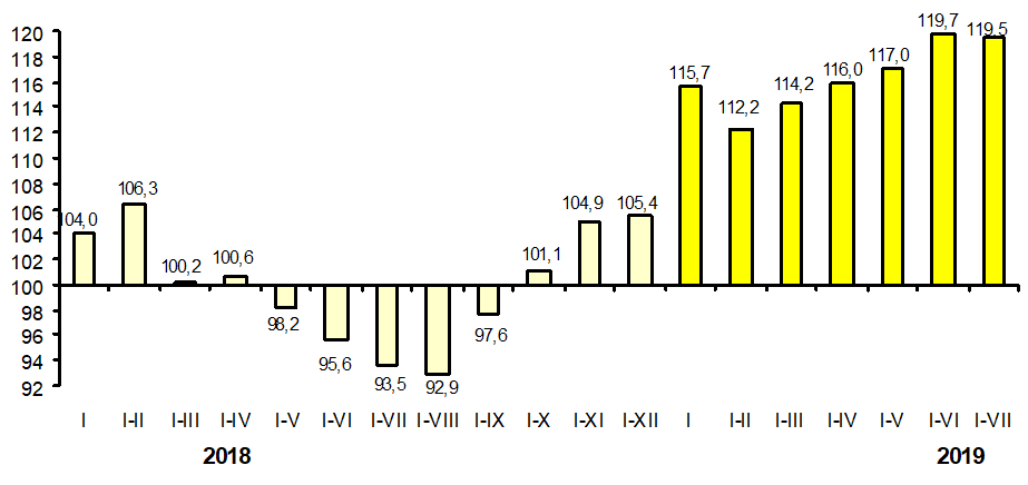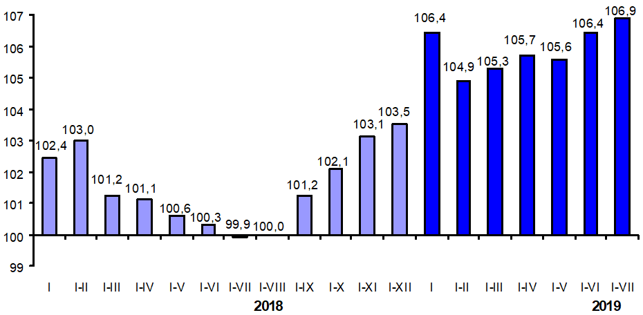 Валовой внутренний продукт в январе-июле 2019 года, по предварительной оценке, составил более 284 миллиардов сомов и по сравнению с январем-июлем 2018 года увеличился на 6,9 процента.