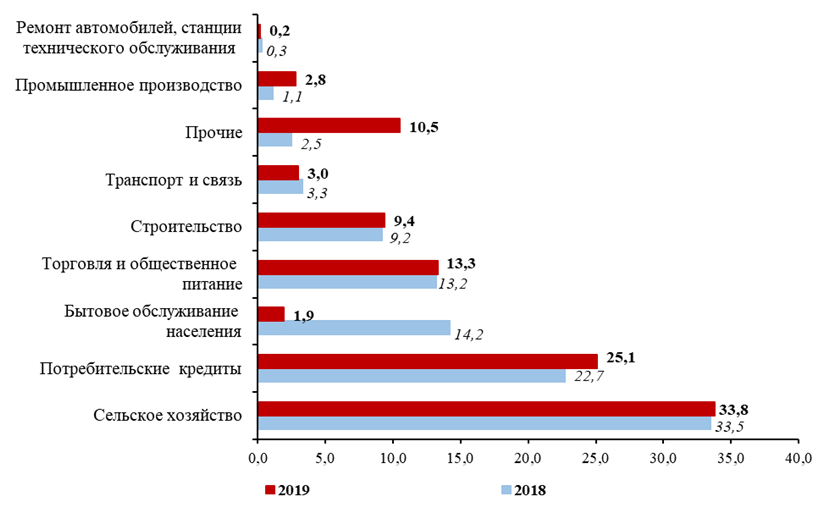 Из общего объема выданных в январе-июне 2019 года микрокредитов 33,8 процента направлено на развитие деятельности в сельском хозяйстве, 25,1 процента заимствовано на потребительские нужды, 13,3 процента - в сферу торговли и общественного питания.