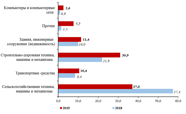Отмечались структурные изменения в сфере предметов финансового лизинга. Сократилась доля стоимости договоров, где предметом лизинга выступали сельскохозяйственная техника, машины и механизмы - с 57,4 процента в 2018 году до 37,0 процента в 2019 году. Наряду с этим, наиболее возросла доля стоимости лизинговых договоров на строительно-дорожную технику, а также на транспортные средства.