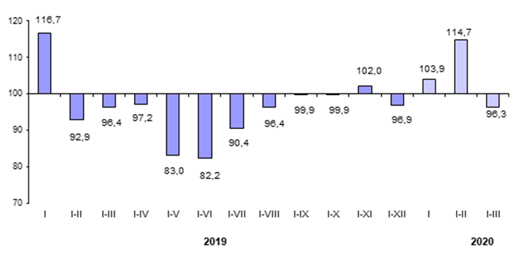 Внешнеторговый оборот Кыргызской Республики, по предварительным данным, в январе-марте 2020 года составил 1364,4 млн. долларов США и по сравнению с январем-мартом 2019 года снизился на 15,8 процента, при этом экспортные поставки уменьшились на 0,8 процента, импортные поступления - на 21,8 процента.