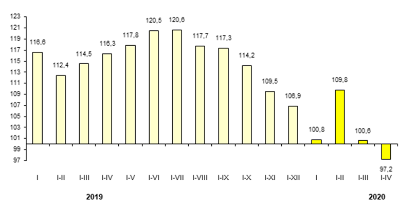 Валовой внутренний продукт в январе-апреле 2020 года, по предварительной оценке, составил около 149 миллиардов сомов и по сравнению с январем-апрелем 2019 года уменьшился на 3,8 процента.