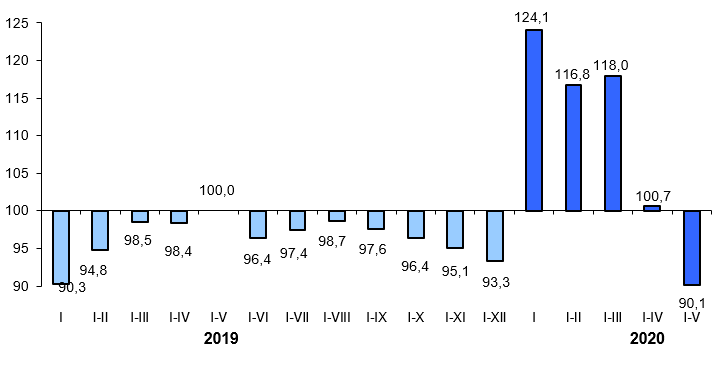 Внешнеторговый оборот Кыргызской Республики в январе-мае 2020 года составил 2 125,8 млн. долларов США и по сравнению с январем-маем 2019 года снизился на 22,7 процента, при этом, экспортные поставки увеличились на 1,2 процента, а импортные поступления, напротив, уменьшились на 31,8 процента.
