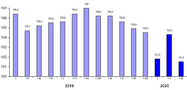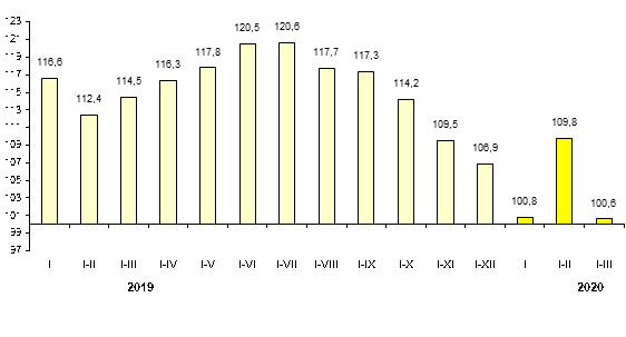 Валовой внутренний продукт в январе-марте 2020 года, по предварительной оценке, составил более 111 миллиардов сомов и по сравнению с январем-мартом 2019 года увеличился на 1,5 процента.