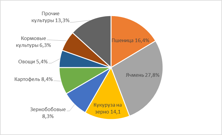 В общей структуре посевных площадей яровых культур на долю ярового ячменя приходится 27,8 процента, яровой пшеницы – 16,4 процента, кукурузы на зерно -14,1 процента, зернобобовых – 8,3 процента, кормовых культур – 6,3 процента, овощей – 5,4 процента, картофеля – 8,4 процента, и других культур – 13,3 процента (сахарная свекла, хлопчатник, табак, масличные и бахчевых культуры, прочие зерновые).
