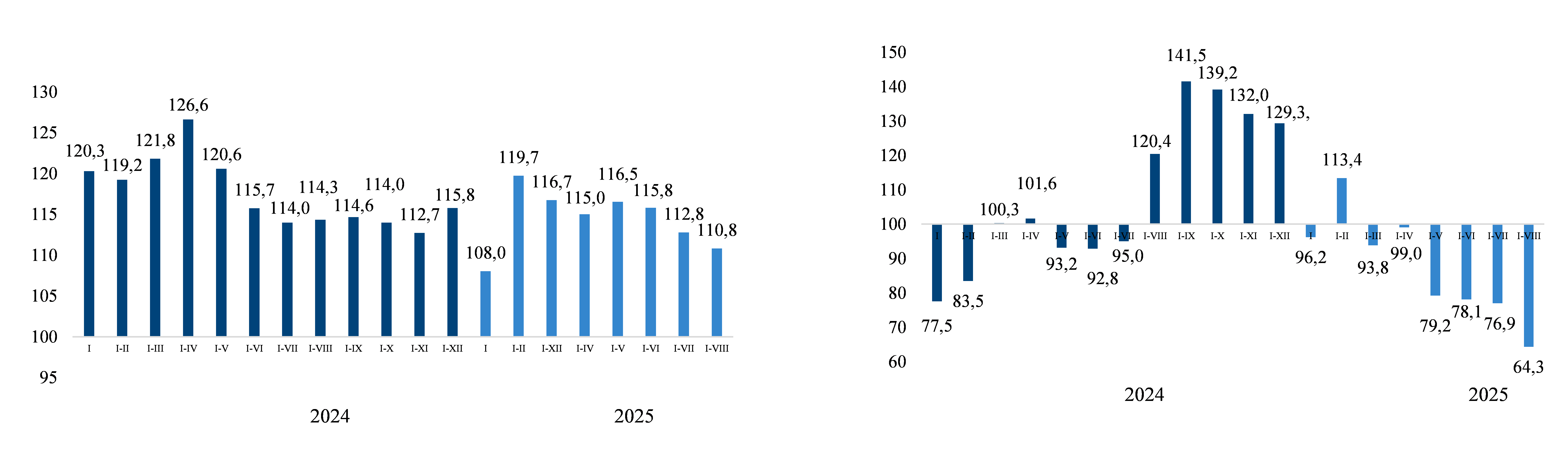Объем внешней и взаимной торговли Кыргызской Республики товарами в январе-августе 2025 года составил 9 848,1 млн. долларов США и по сравнению январем-августом 2024 года уменьшился на 9,1 процента. При этом, экспортные поставки снизились на 23,7 процента, импортные поступления - на 5,2 процента.
