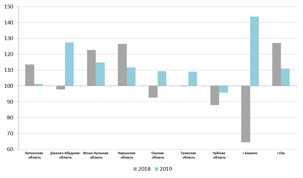 По сравнению с январем-сентябрем 2018 года ввод в действие жилых домов увеличился во всех регионах, за исключением Чуйской области. Наиболее значительный рост наблюдался, в городе Бишкек – на 43,7 процента и Джалал-Абадской области – на 27,4 процента.