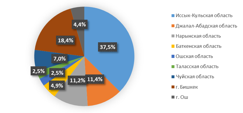 Основная часть коллективных средств размещения и предприятий туризма расположены в Иссык-Кульской области - 37,5 процента, Бишкеке – 18,4 процента, Джалал-Абадской области – 11,4 процента, Нарынской области – 11,2 процента.