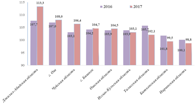 В 2017г. по сравнению с предыдущим годом наибольший рост реального валового регионального продукта достигнут в Джалал-Абадской области (на 13,3 процента), г. Ош (на 8,0 процента) и Чуйской области (на 6,4 процента) а его снижение отмечалось в Нарынской области (на 1,2 процента) и в Баткенской области (на 0,5 процента).