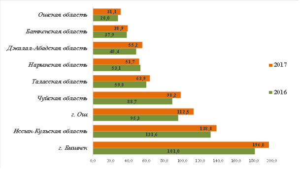 Отмечался ежегодный рост объемов валового регионального продукта на душу населения. В 2017г. выше среднереспубликанского уровня этот показатель сложился в г. Бишкек (в 2,2 раза), Иссык-Кульской области (в 1,5 раза), г. Ош (в 1,3 раза) и Чуйской области (в 1,1 раза).
