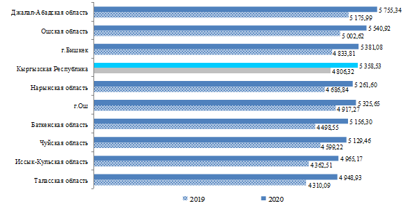 Наибольшая величина прожиточного минимума в 2020 году отмечается в Джалал-Абадской области, Ошской области и по городу Бишкек. При этом, по сравнению с 2019 годом, наибольший рост величины прожиточного минимума отмечен в Таласской области (на 14,8 процента), Баткенской (на 14,6 процента) и Иссык-Кульской (на 13,8 процента) областях.