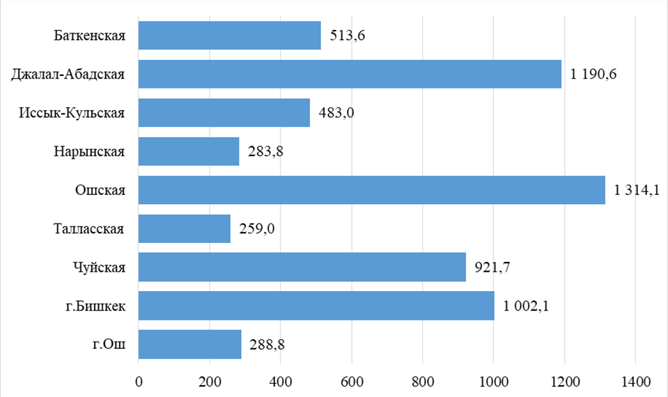 Самыми густонаселенными областями, где на один кв. км приходится 45-46 человек, являются Ошская и Чуйская области, а самой малонаселенной - с минимальной плотностью 6 человек на один кв. км - Нарынская область.