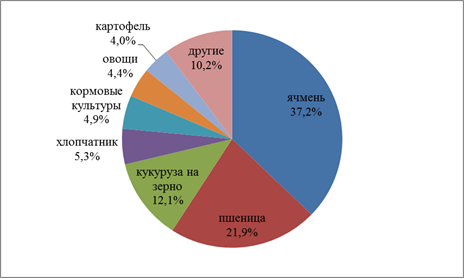 В общей структуре посевных площадей яровых культур на долю ярового ячменя приходится 37,2 процента, яровой пшеницы - 21,9 процента, кукурузы на зерно -12,1 процента, хлопчатника - 5,3 процента, кормовых культур - 4,9 процента, овощей - 4,4 процента, картофеля – 4,0 процента, и других культур – 10,2 процента (сахарной свеклы, табака, масличных и бахчевых культур, прочие зерновые).