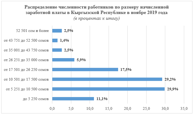 Средняя заработная плата работников по видам экономической деятельности в республике варьируется от 9 до 36 тысяч сомов в месяц. В январе-сентябре 2020 года среднемесячная номинальная заработная плата одного работника (без учета малых предприятий) составила 17 926 сомов и по сравнению с январем-сентябрем 2019 года увеличилась на 9,2 процента.
